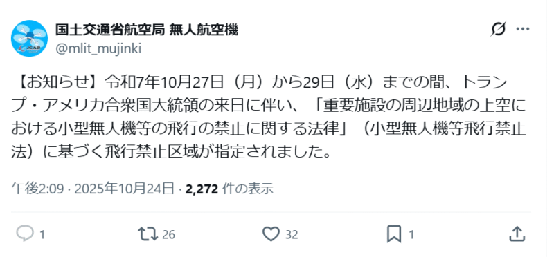2025.10.24高市内閣発足に伴いトランプ大統領が来日予定。ということは、無人航空機飛行禁止空域が指定されます!