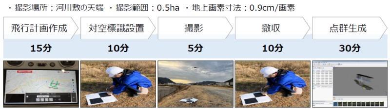 飛行計画作成から点群作成(精度検証)まで1時間少しと、短い時間で完了する。
