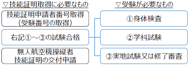 ①技能証明申請者番号→②下記ABCの試験合格→③無人航空機操縦者技能証明の交付申請