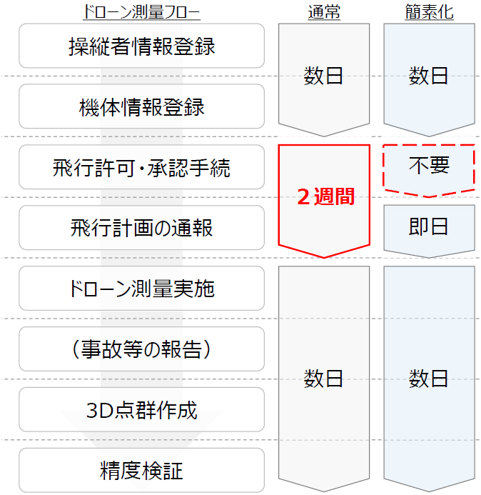 ドローン測量の飛行許可申請を省略し、測量業務を大幅に効率化できます。